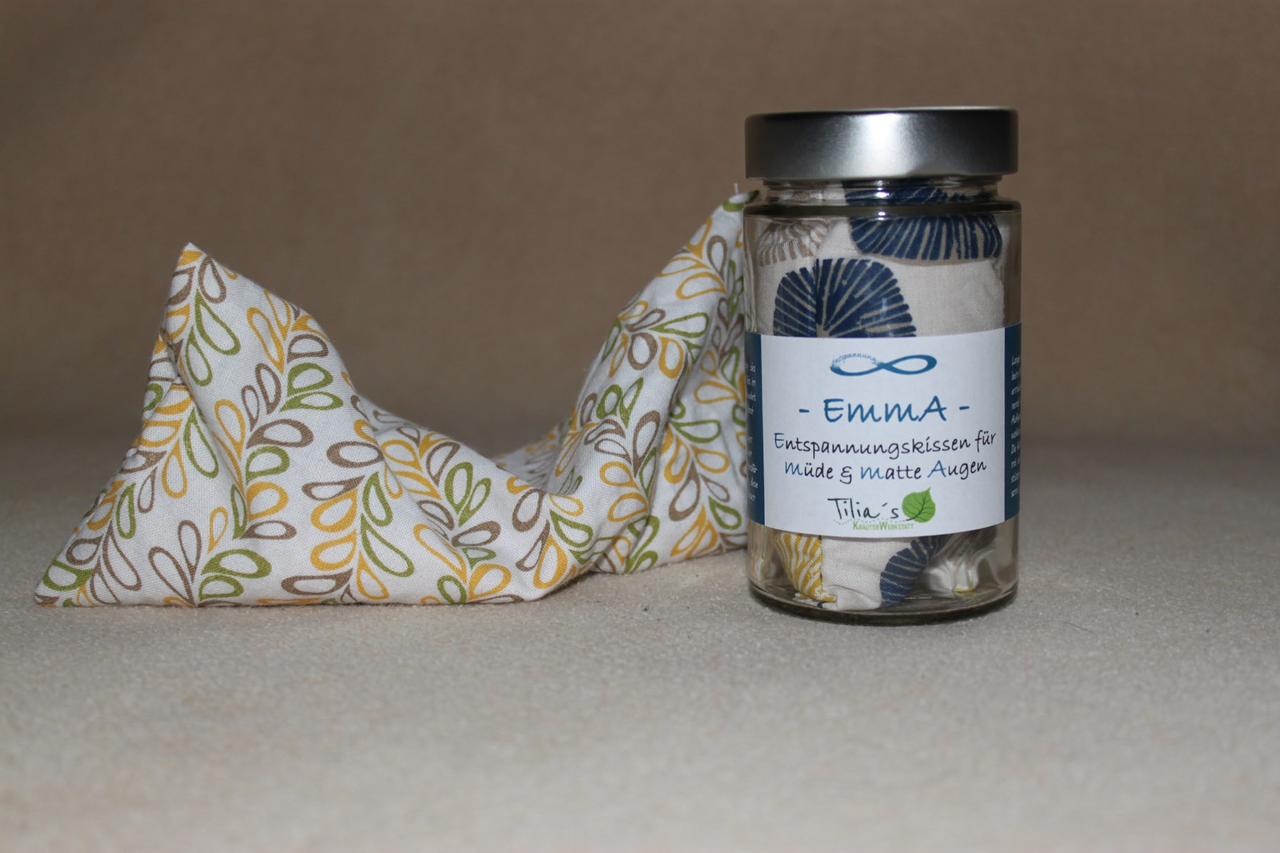 Für eine optimale Lagerung wird EmmA im Glas geliefert. So hält sich der Duft des ätherischen Öles und das Kissen nimmt keine Umgebungsgerüche auf.